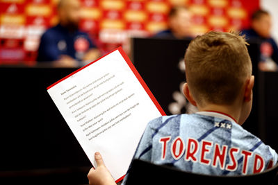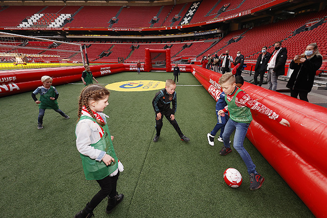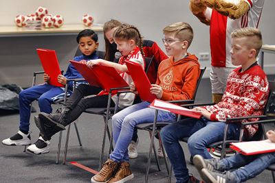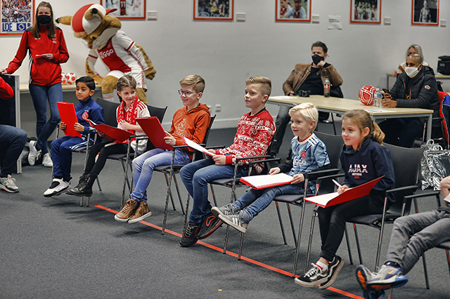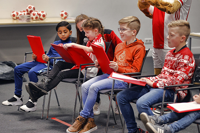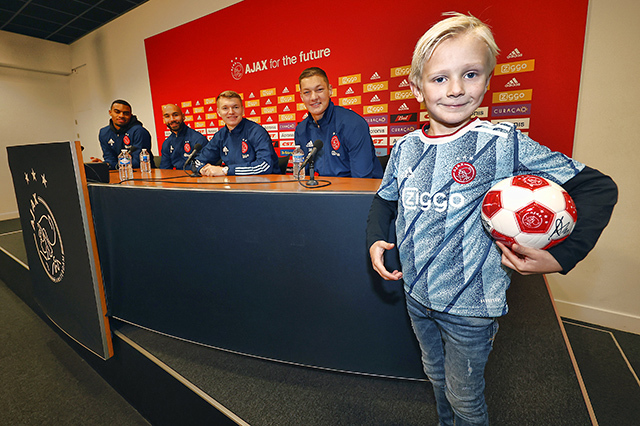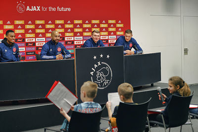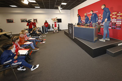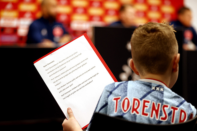 De allerleukste persconferentie van Nederland vond zondagmiddag plaats in de Johan Cruijff Arena. Acht prijswinnaartjes van de Ajax Kids Club kwamen naar het Ajaxstadion om daar Ryan Gravenberch, Sean Klaiber, Perr Schuurs en Kjell Scherpen aan een waar vragenvuur te onderwerpen. Dat levert een heerlijke video en toffe foto's op.
