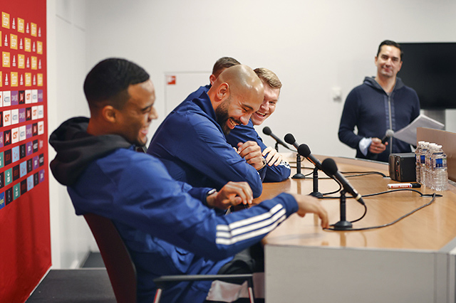 Dat snappen we ook wel, hoor! Na de nodige doelpunten was het toch echt tijd om naar de perskamer te gaan, waar het wachten op Gravenberch, Klaiber, Schuurs en Scherpen begon. Toen de vier Ajacieden binnen waren, kon het vragenfeest beginnen.