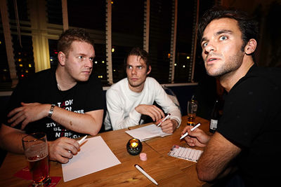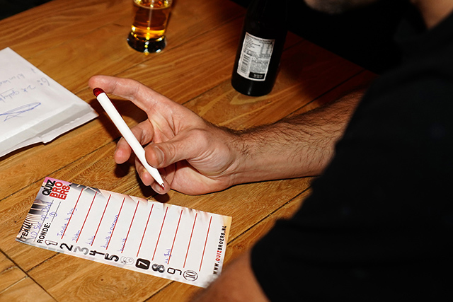 Ja kijk, vragen op dát niveau dus. Ga er maar aanstaan! En precies dat is wat de veertien teams deden, alles uiteraard onder het genot van een natje en een droogje. Een lekker biertje smaakt prima als je moet nadenken over bovenstaande vraag, waarop het antwoord overigens Fabian Sporkslede is.