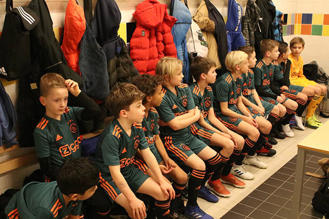 In de kleedkamer van het Gelredome, het stadion van Vitesse, was het nog best lekker warm. Het was de plek waar onze mascottes hun Ajaxkleding aantrokken, waarna ze de spelerstunnel in gingen. Pfoe, daar was het een stuk frisser! Maar hé, Ajax Kids Clubmascottes zijn stoere mascottes, dus die piepen niet bij een beetje kou!