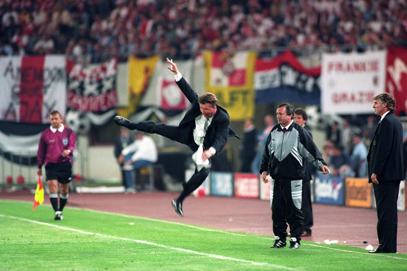 Naast het puntertje van Patrick Kluivert is de karatetrap van Louis van Gaal een iconisch beeld uit de finale van 24 mei 1995. De oud-gymnastiekleraar speelde met vuur en had geluk dat vierde man Adrian Porumboiu niet de man met de fluit was…