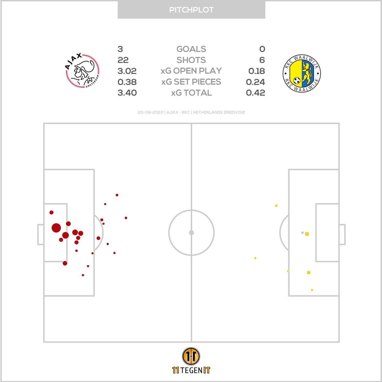 We kunnen in een analyse natuurlijk niet voorbijgaan aan het xG-plot en pitch plot. Maar beschouw het als een goed teken dat we er pas zo laat mee komen aankakken, want grote kans dat het plot zo standaard is dat... Ja, dat Ajax gewoon een regelmatige zege boekte.
