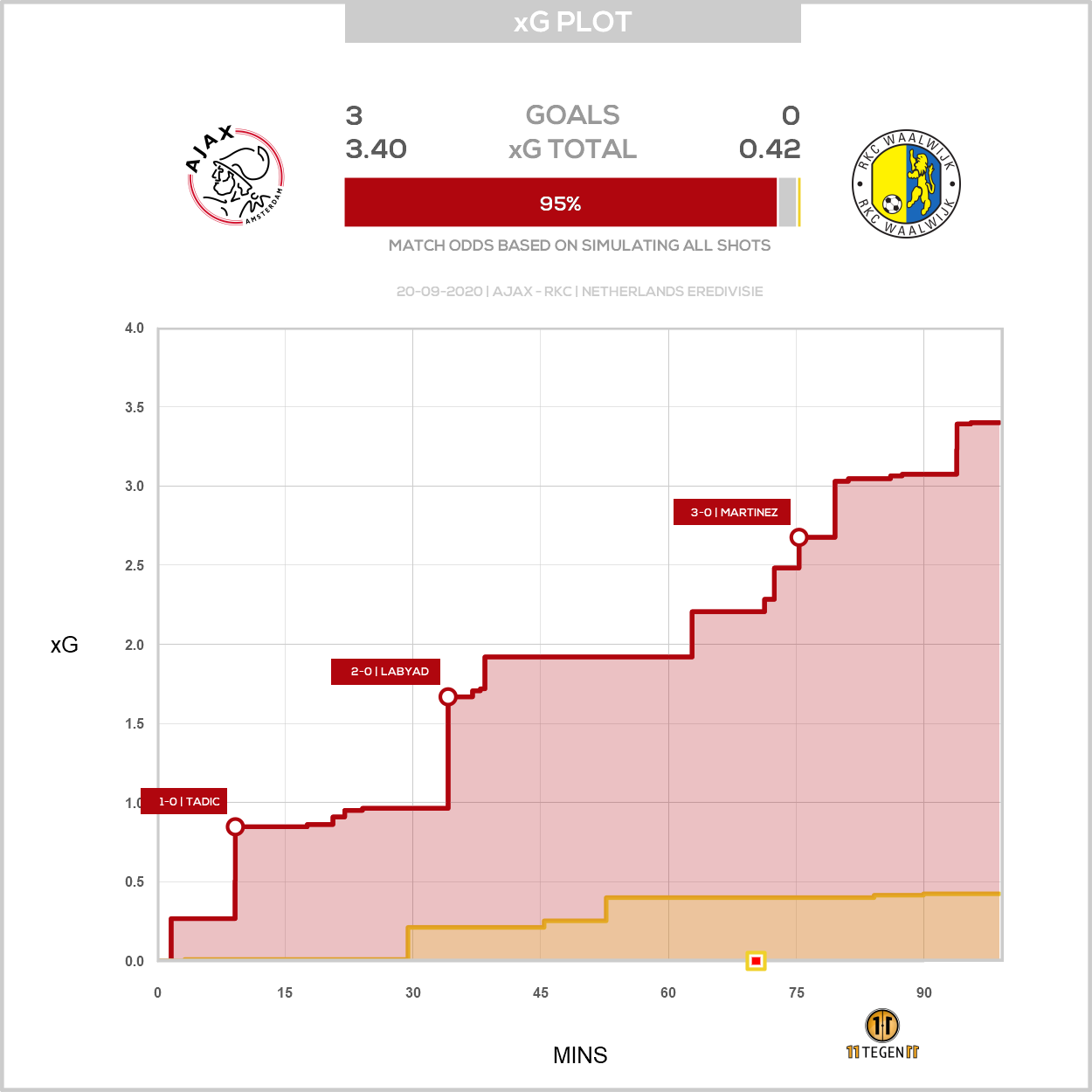 Je ziet in het plot dat Ajax zijn grootste kansen daadwerkelijk omzette in een doelpunt en dat de score wel iets hoger had kunnen uitvallen, maar dat dubbele cijfers ook niet bepaald waarschijnlijk waren. Alhoewel, wat zou er zijn gebeurd als de vroege 2-0 was goedgekeurd? Hoe dan ook, de trapsgewijze opstapeling van doelgevaar is precies wat we graag zien.