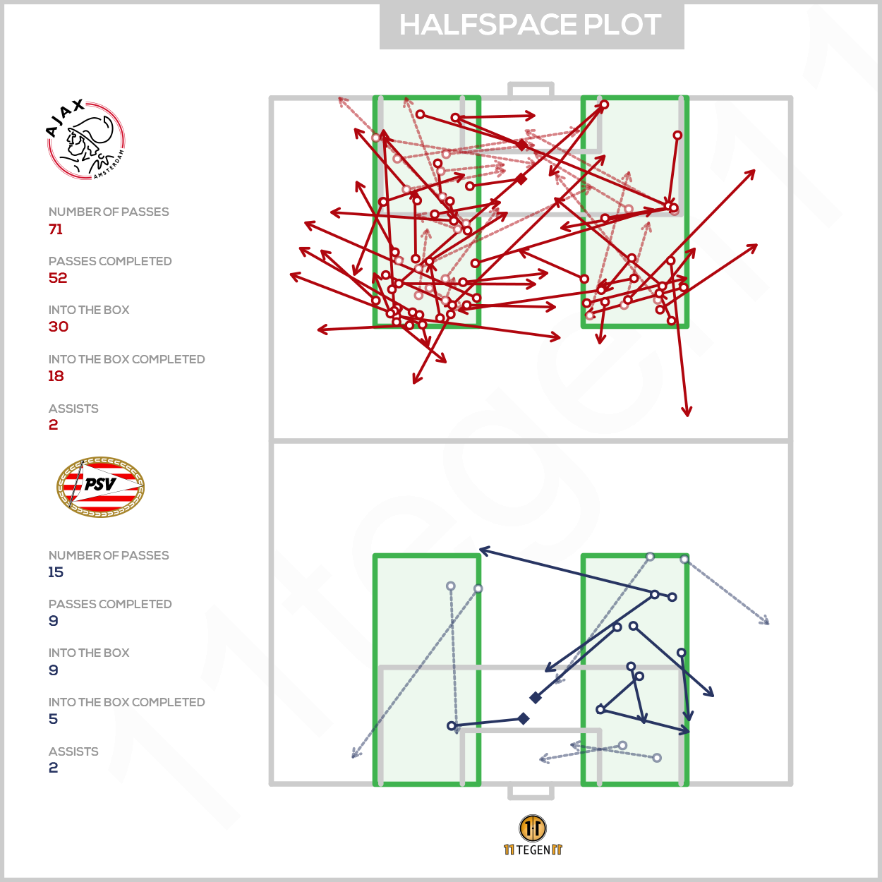 Bij Ajax valt op dat er toch nog 34 passes uit deze zone kwamen, een aantal dat niet onderdoet voor het aantal passes binnen Zone 14 in sommige Champions League-wedstrijden. Wie goed kijkt, ziet dat de meerderheid vanuit de linkerkant van dit vak kwam, zoals we later in de halfspace ook een focus aan de linkerkant zullen zien.