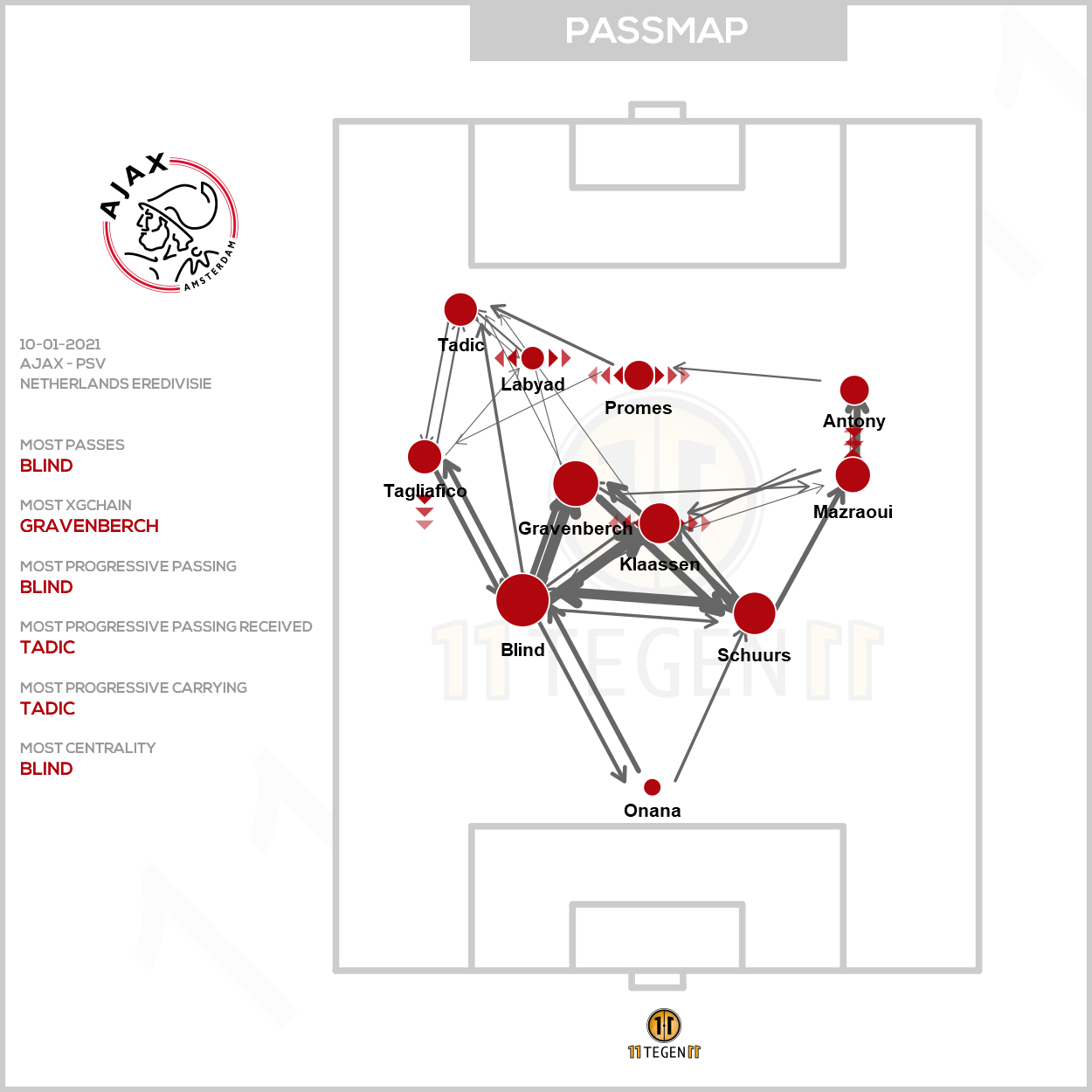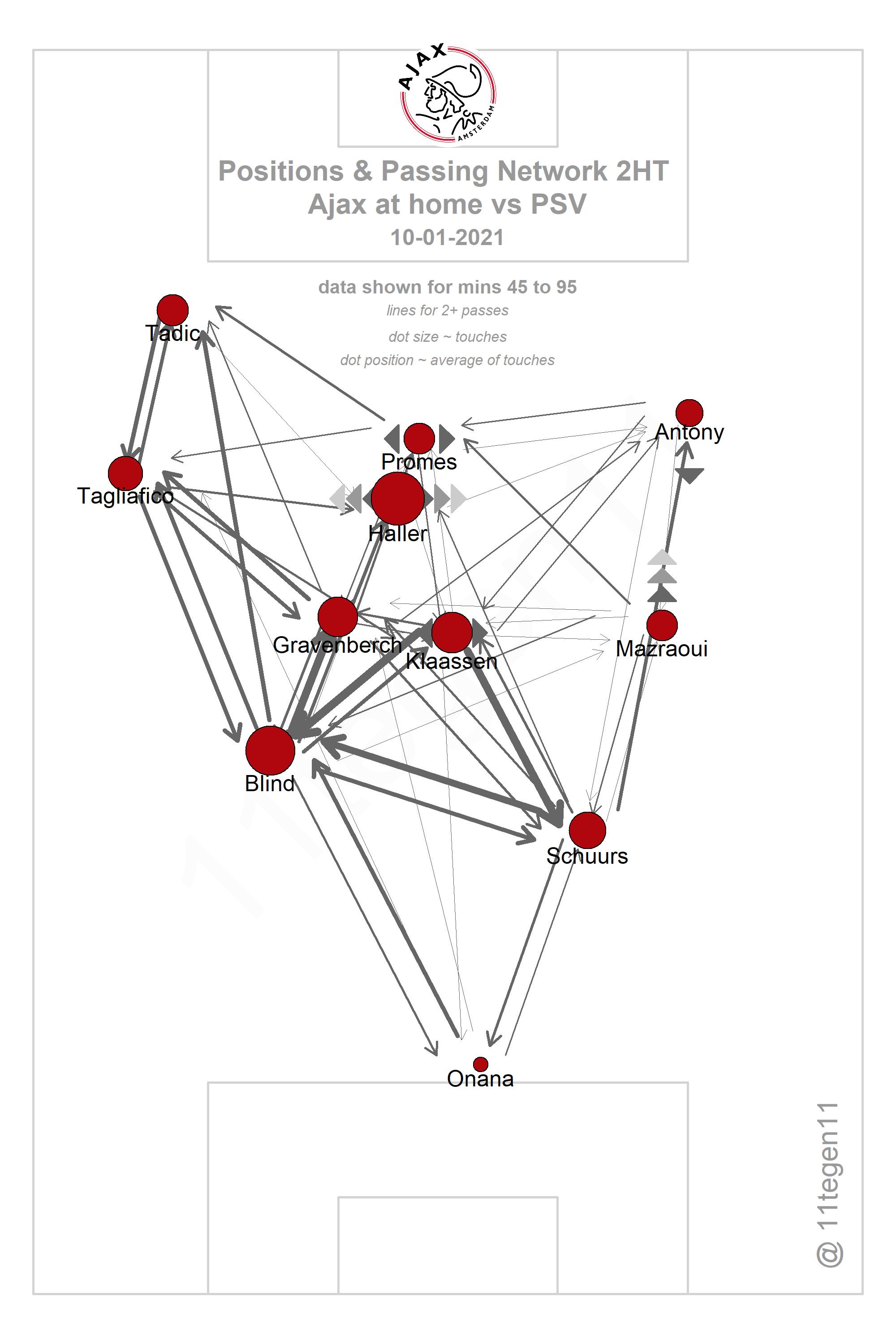 We zien aan de passmap dat er weinig passing door het centrum kwam; de dikste lijn is te zien tussen de sterk spelende Noussair Mazraoui en Antony. Quincy Promes maakt op 'tien' nog de meest geïsoleerde indruk. De oplettende kijker zag redelijk wat diepteloopacties van Promes, maar vaak werd de aanvaller niet betrokken in het spel. Zijn allerbelangrijkste balcontact was het doelpunt vijf minuten voor rust.