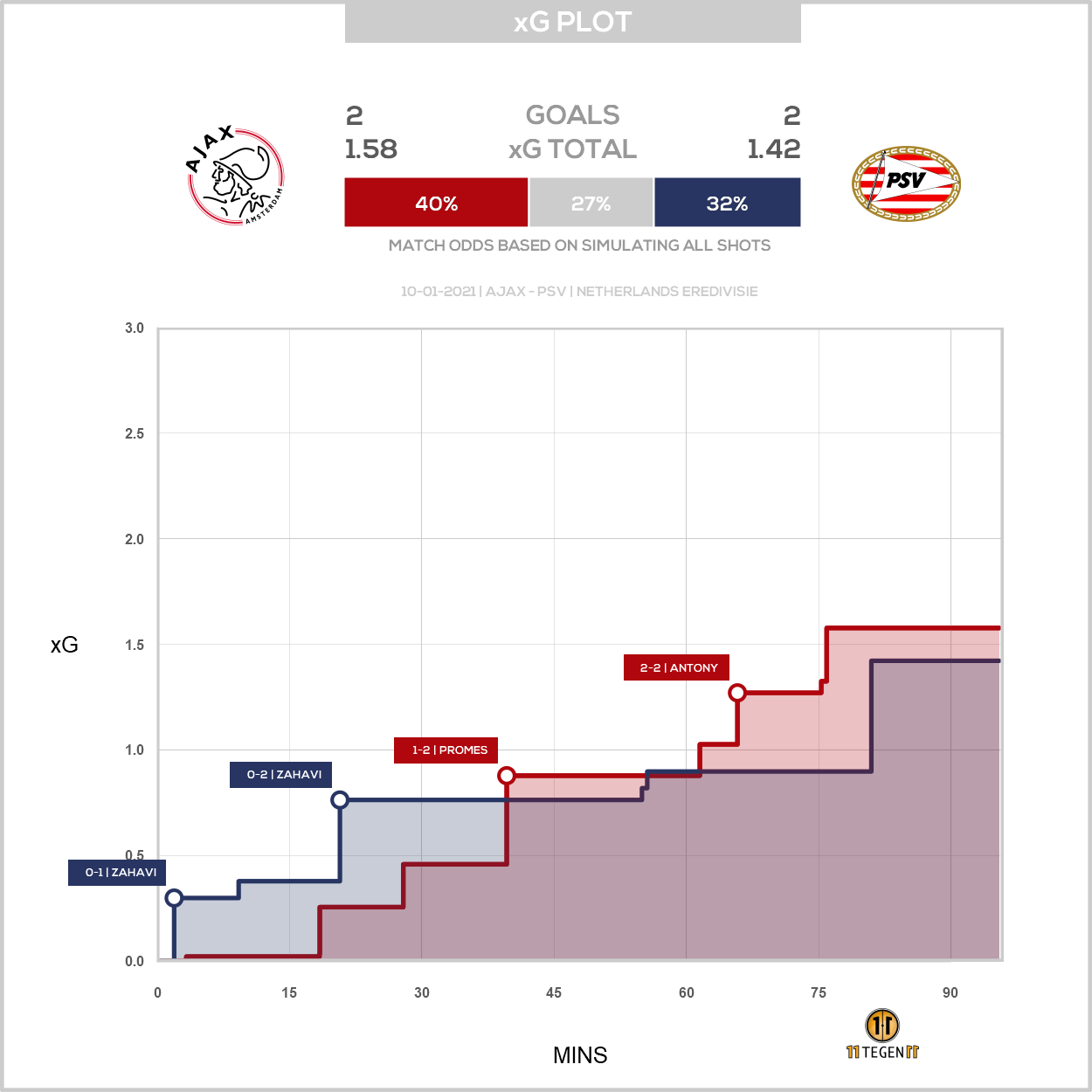 PSV schoot 'slechts' zes keer, tegen negen keer voor Ajax. De kwaliteit van de schoten was dus erg hoog, want uit die vijftien schoten vielen wel vier goals, iets dat volgens het model van 11tegen11 niet als heel onwaarschijnlijk wordt gezien.