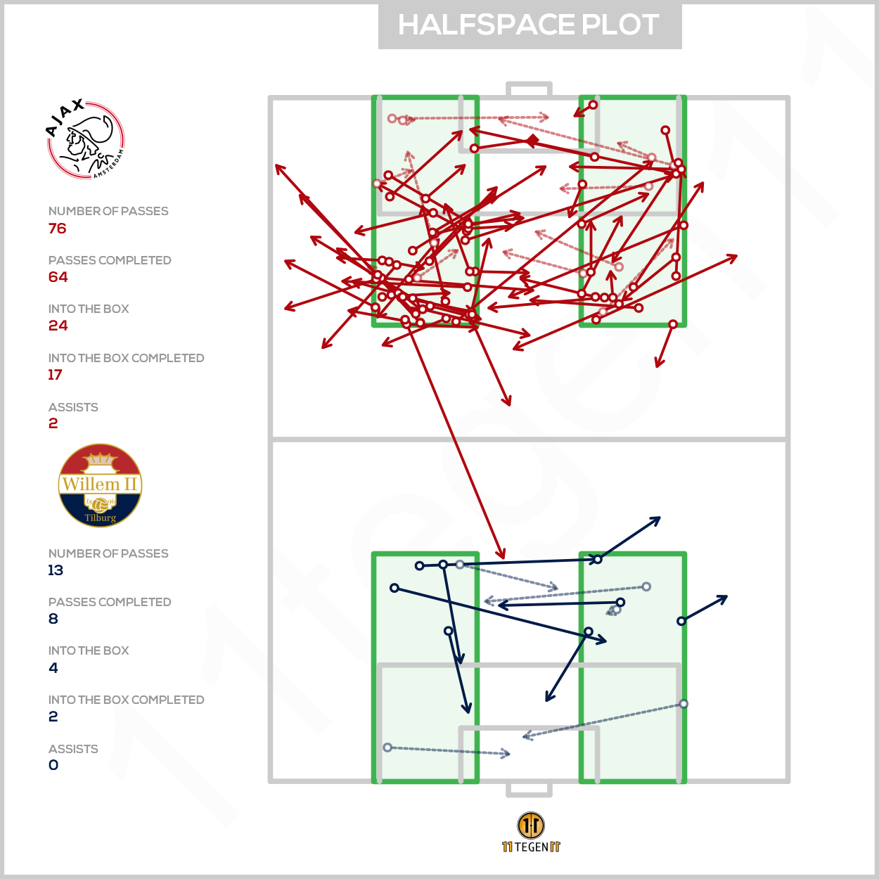 De kale lijntjes zoals getrokken op de plots van Zone 14 en de halfspaces maken ook duidelijk dat Ajax in de as van het veld een extra verzetje op het middenveld kan gebruiken. Van wie? Geen idee, wie weet heeft David Neres het in zich. Maar vanuit Zone 14 worden vooral de zijkanten opgezocht en ook in de halfspaces is het vizier op de flanken gericht, ditmaal voornamelijk op links.