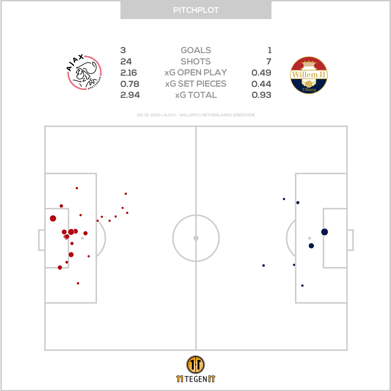 Hoewel Ajax pas in de slotfase definitief afstand wist te nemen van Willem II kunnen we niet anders dan concluderen dat er een terechte overwinning werd geboekt. Een blik op het plot vol Expected Goals leert dat het wachten was op doelpunten zodra Ajax serieus kon aanzetten. Als je kijkt naar de tweede helft, was haast sprake van een kansenregen.