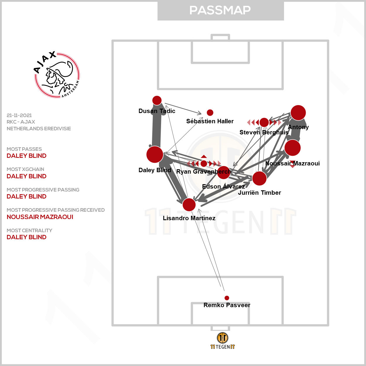 Wat het ook was, Ajax schoot tegen RKC wel weer met scherp en boekte een zeer regelmatige 0-5-overwinning. We bekijken het aan de hand van de passmaps en Expected Goals, verkregen via 11tegen11.