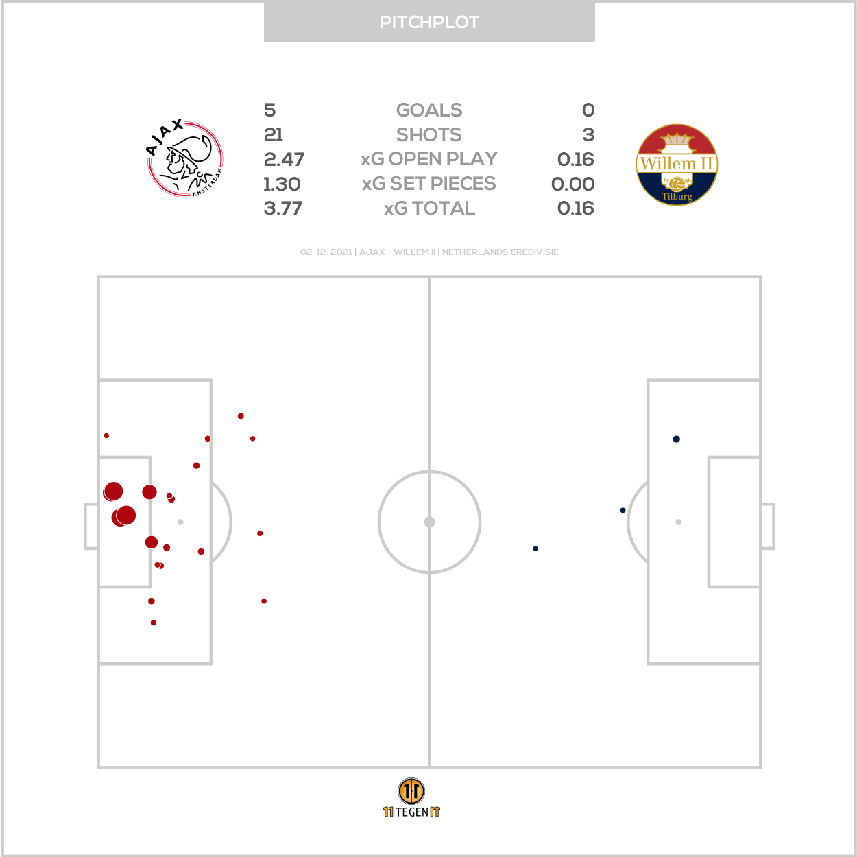 Hoe dan ook, Ajax won dik. Op de passmap zien we de dingen die we altijd zien als Ajax dik van een andere ploeg wint, op een paar kleine puntjes na. En we zoomen ook nog in op de prestaties van het verdedigende fort Ajax. Dat en meer in deze terugblik op Ajax - Willem II aan de hand van de passmaps en Expected Goals, verkregen via 11tegen11.