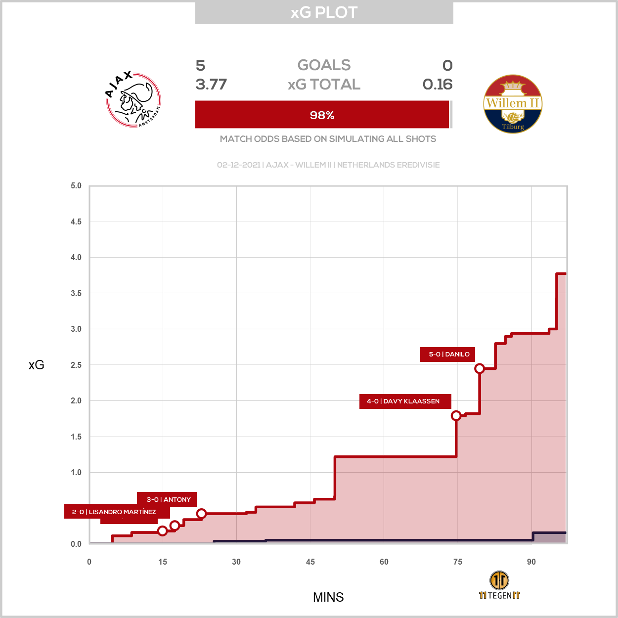Ajax won op een koude donderdagavond in een lege Arena zakelijk met 5-0 van Willem II. Door weer de nul te houden, behaalde Ajax enkele opvallende mijlpalen. Dit team is aanvallend goed en verdedigend geweldig. Dat en meer in deze terugblik aan de hand van de statistieken!