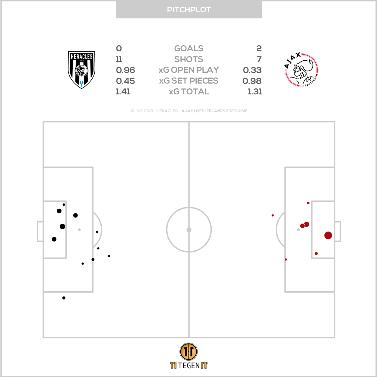 Een andere kanttekening bij de xG-verhouding is dat Heracles Ajax pas definitief na de 0-2 voorbij stak. Dat patroon zie je wel vaker. Als het gat is geslagen, brandt er nog wat xG na. Too little, too late. Maar je begrijpt na het zien van dit plot wellicht wel waarom Erik ten Hag vrij kritisch was.