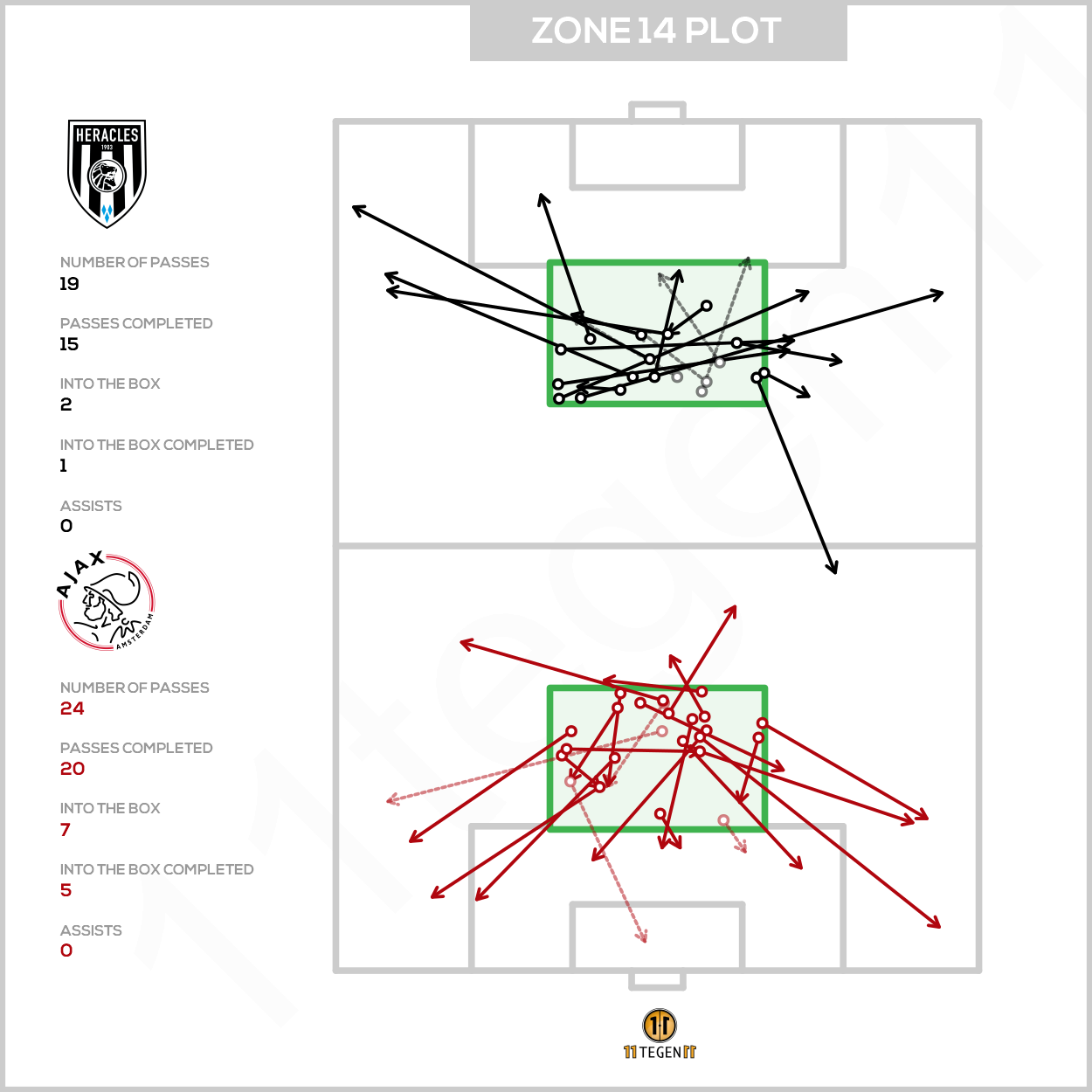 De vele lange ballen hebben zo hun weerslag op de activiteit voorin. De manier van spelen was heel anders dan tijdens de bekerwedstrijd tegen PSV, waardoor de activiteit in Zone 14 en de halfspaces stukken lager komt te liggen. Dit vertelt het een en ander over de veelzijdigheid van Ajax, want dezelfde spelers vervulden heel andere rollen.