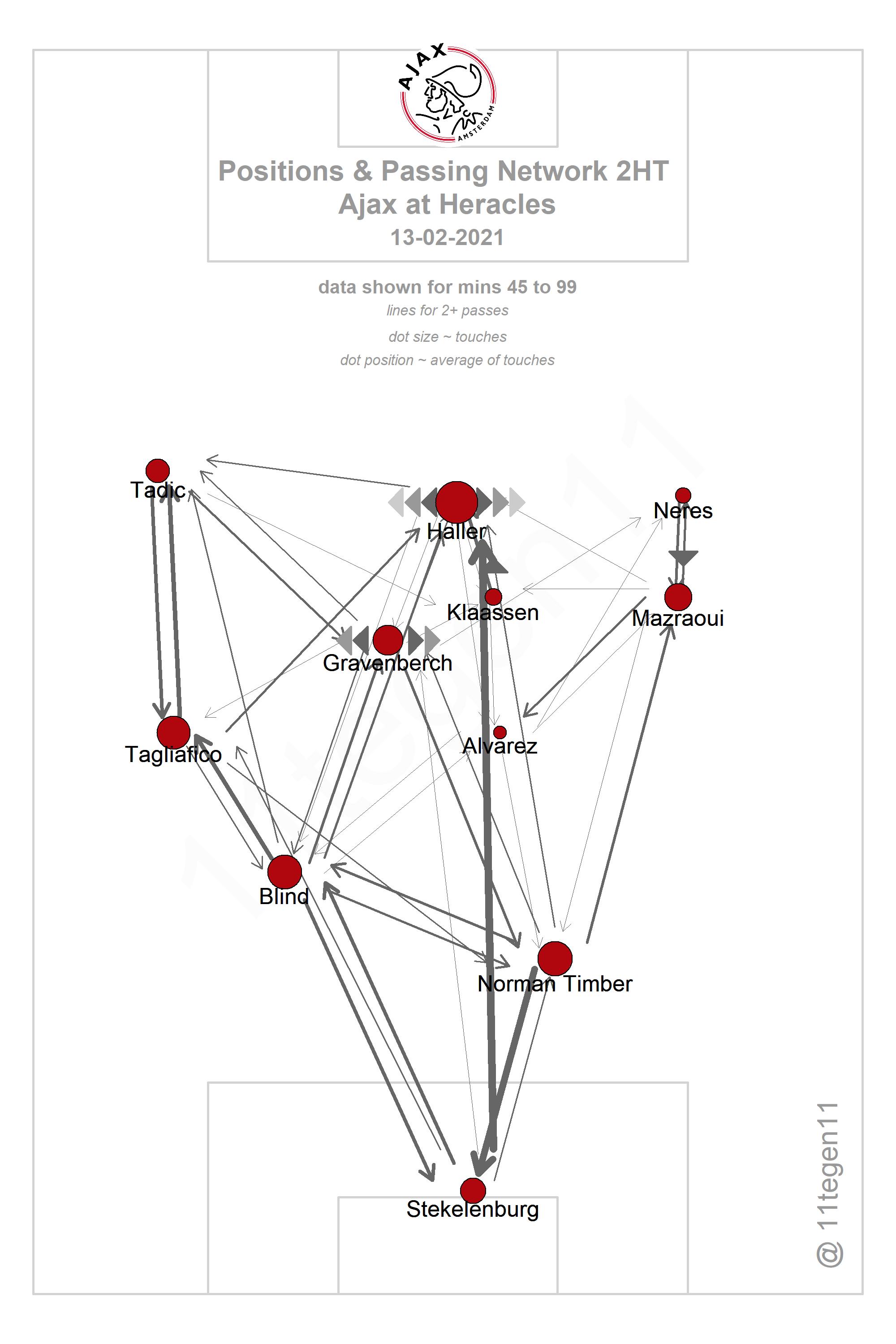 De 0-2 is een uitstekend voorbeeld waarbij veel van deze uitleg samenkomt. Een lange bal van Stekelenburg voorbij vijf spelers van Heracles, Tagliafico en Haller die kantelen naar de flank die Antony bevolkt, een balvaste Haller, terugkantelen naar de inmiddels vrije zone op links, gevolgd door een voorzet en afwerking!