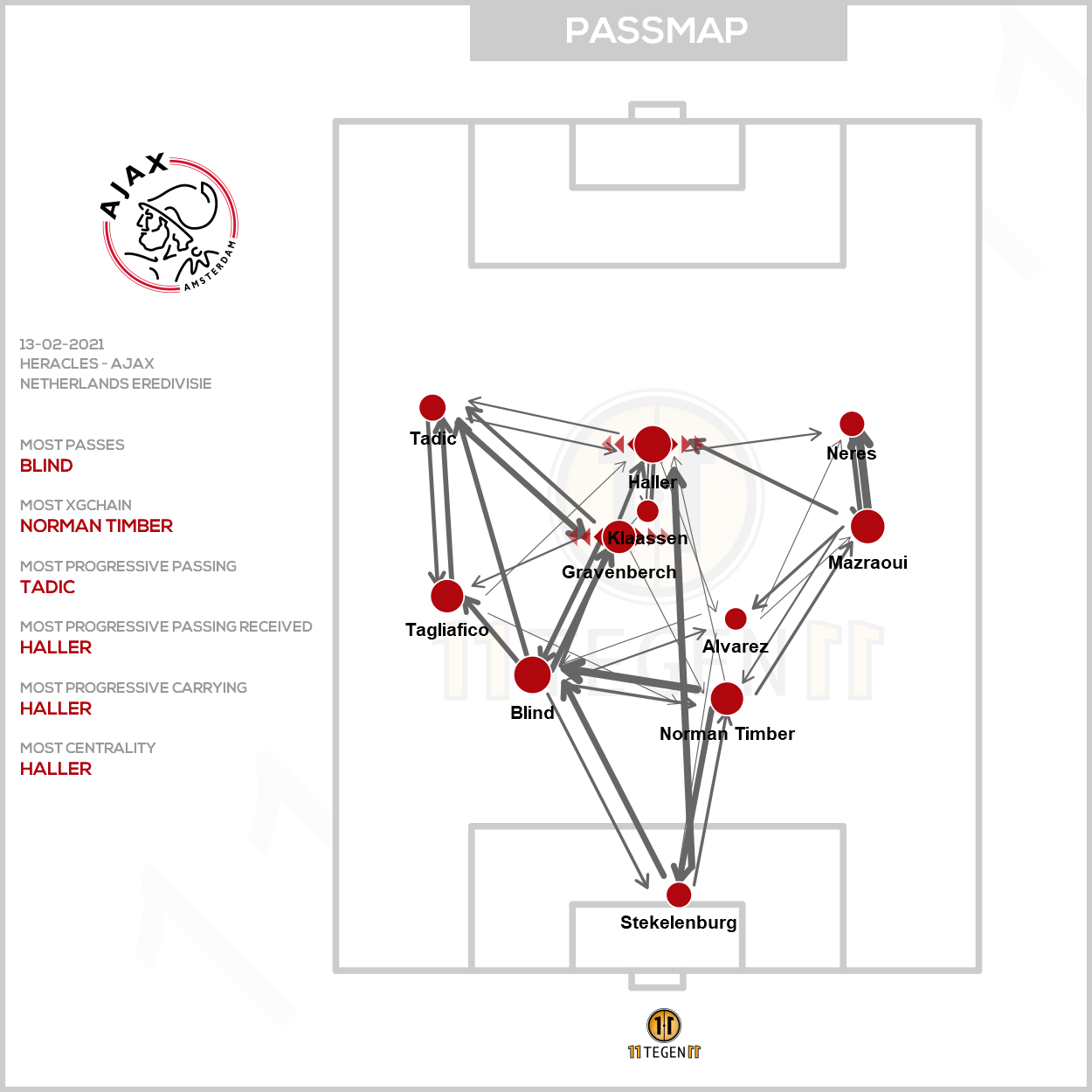 We worden bij Ajax niet per se vrolijk van lange ballen, maar in dit geval... was het een goede manier om de pressie van Heracles te omzeilen. Deze tactiek werkte mede dankzij de kopsterke Haller. De nieuwe aanvalsleider won maar liefst acht kopduels! Verreweg het meeste van alle spelers op het veld.