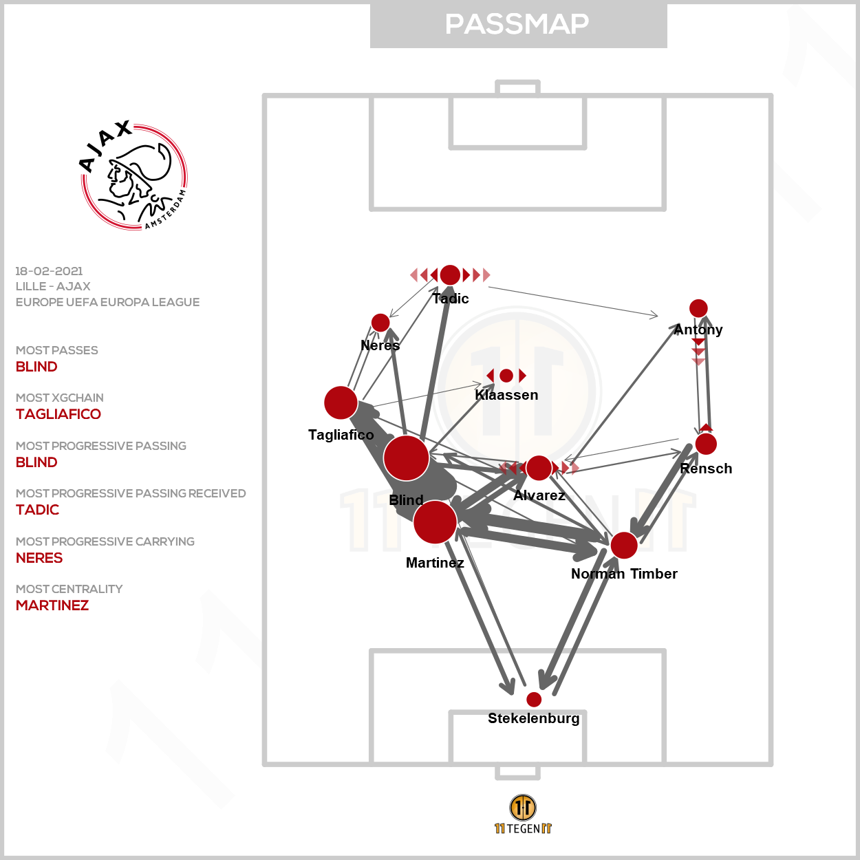 Dynamische passmap! Complimenten voor het spel van #Ajax! Maar toch ook zeker voor de wijze waarop Lille verdedigde. De vier voorwaartsen waren lastig te bereiken, vandaar dat Tadic nogal zwierf in jacht op de bal. #lilaja #UEL pic.twitter.com/iokP6IokKa