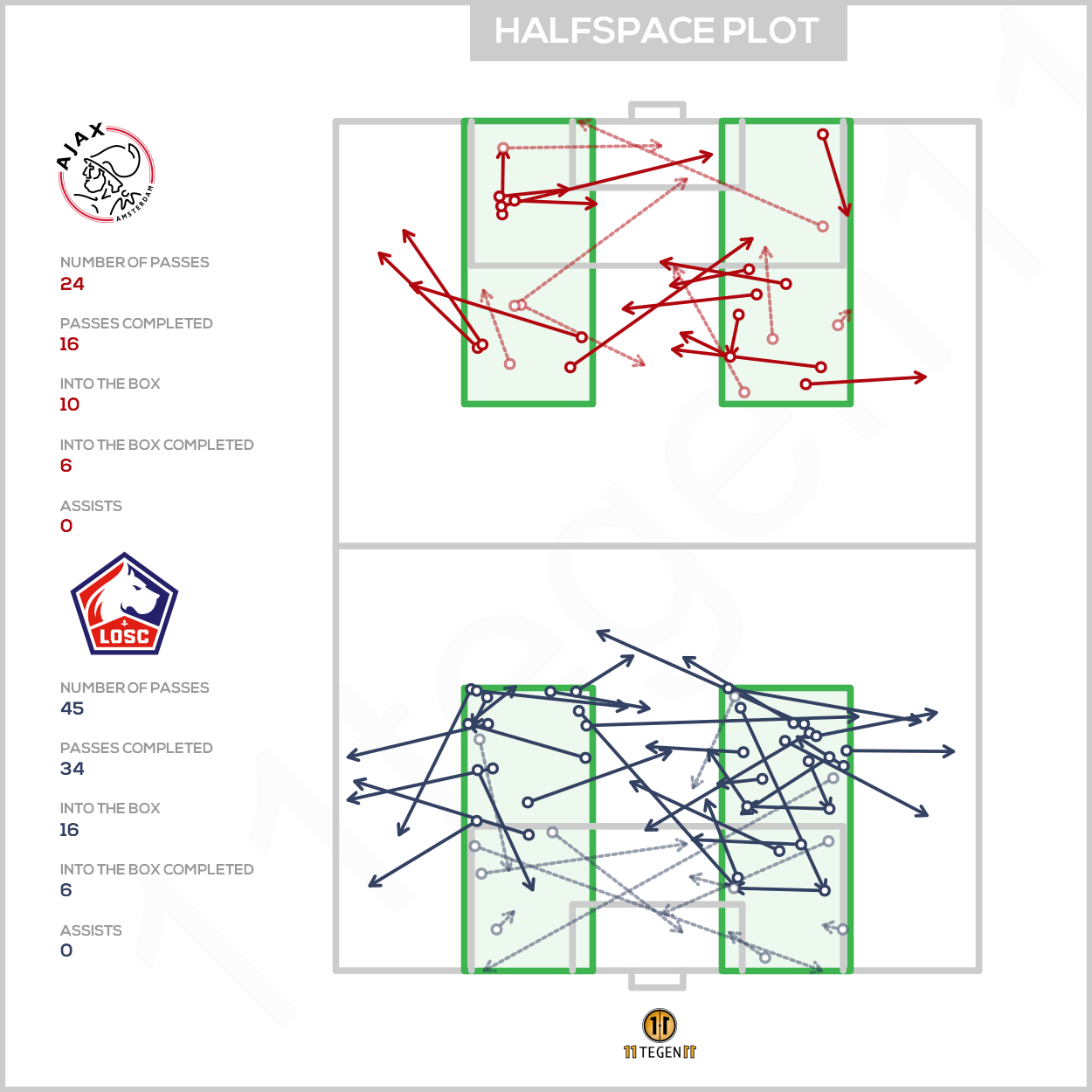 In de halfspaces zien we wat we op basis van de passmap al konden verwachten: Ajax had moeite om de aanvallers te vinden. Lille kwam bijna twee keer zo vaak in de halfspaces. Waar we normaal gesproken als Ajax goed speelt een voorkeur voor aanvallen over één kant zien, is hier sprake van een gelijke verdeling.