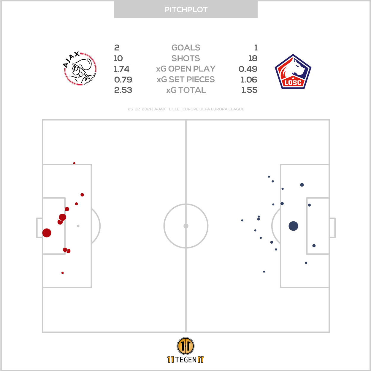Hoewel Lille vaak in en rond de zestien van Ajax te vinden was, laten de cijfers zien dat de Fransen, zonder de penalty mee te rekenen, nauwelijks tot echte kansen kwam. Dat is ook goed terug te zien aan het hoge aantal schoten dat Lille van buiten het zestienmetergebied iondernam: maar liefst 11 van de 18.