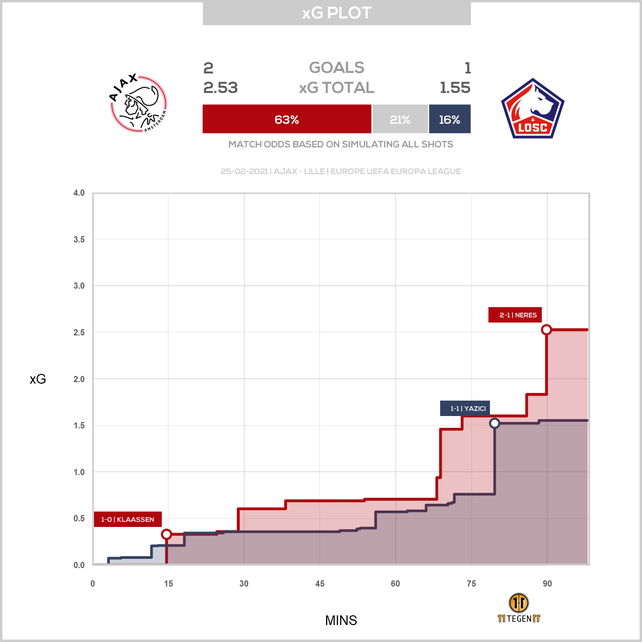 Waar Lille - Ajax een wedstrijd zonder veel grote kansen was, ging het donderdag meer heen en weer. We zien dat Lille de eerste helft plaagstootjes uitdeelde, waarbij vooral de door Martínez van de lijn gehaalde bal in het oog springt. Deze kans wordt door het model van 11tegen11 niet als een bijzonder grote mogelijkheid gezien, wellicht door de afstand en het aantal verdedigers tussen de schutter en het goal.