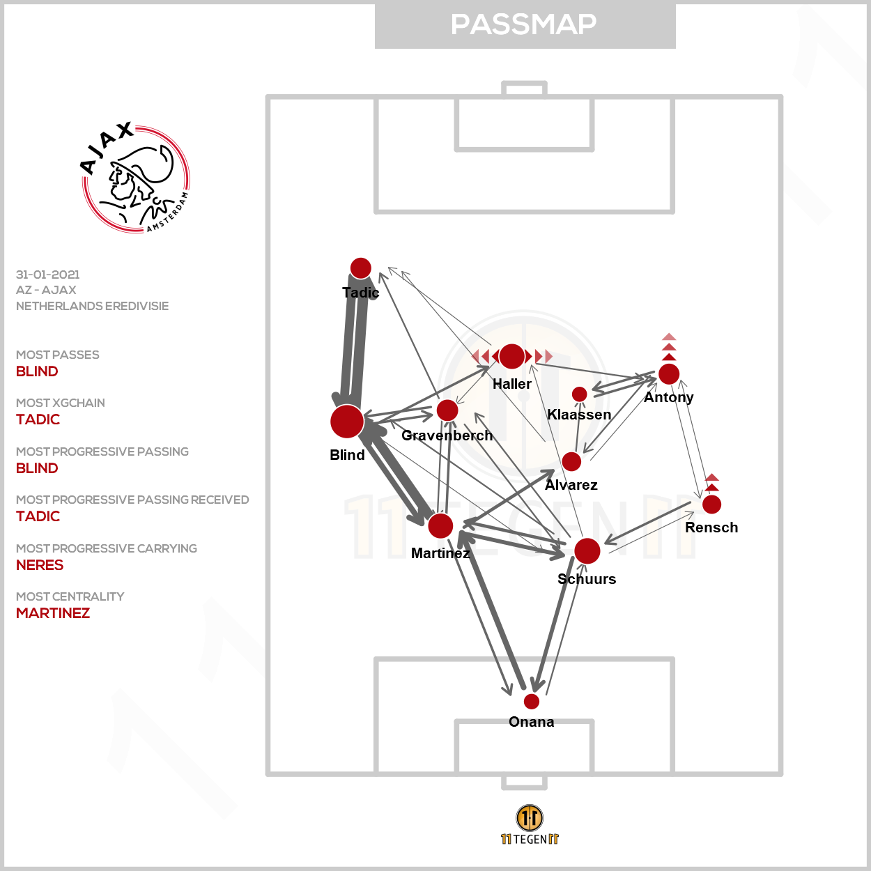 0-3 tegen AZ! Wat vertelt de dynamische passmap? #Ajax had 'maar' 50 procent balbezit, dus minder passing dan normaal. Blind de grote spelmaker, Tadic het aanspeelpunt. Álvarez was met name goed zonder bal. Oh ja, inzakken geblazen in tweede helft! #azaja pic.twitter.com/SESwBGs3Ci