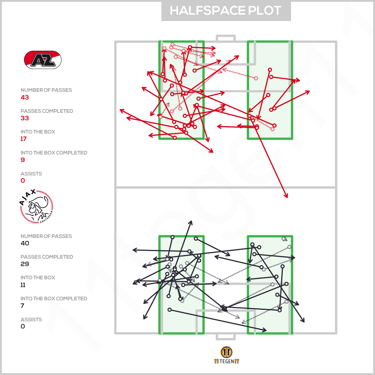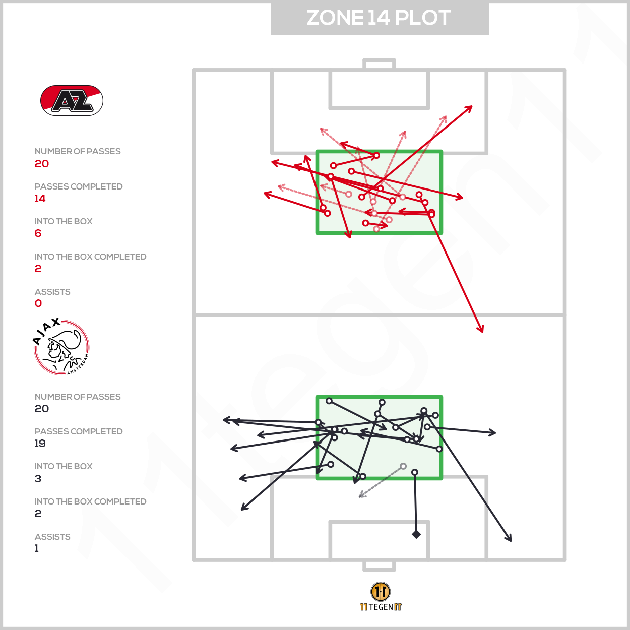 AZ en Ajax hadden als gevolg hiervan precies evenveel passes in Zone 14. Die gelijke verhouding houdt dus ook gelijke tred met de verdeling van het balbezit. We zien bij Ajax vooral veel passes naar de zijkanten en bij AZ wat meer passes de zestien in.