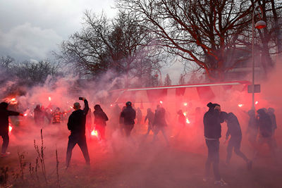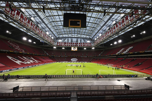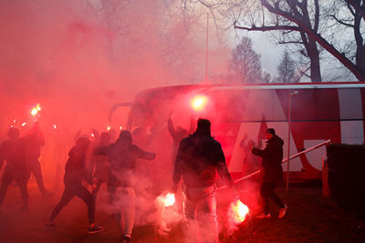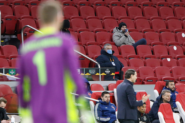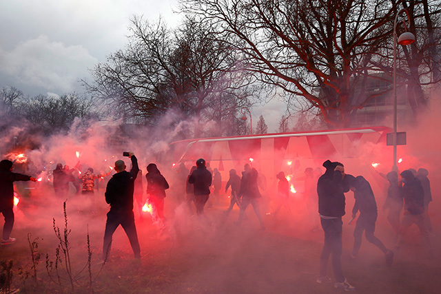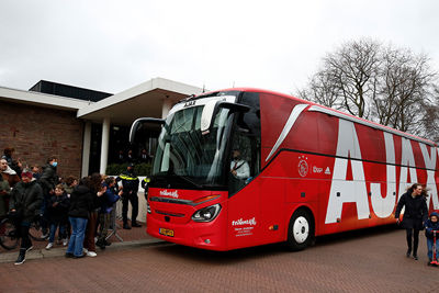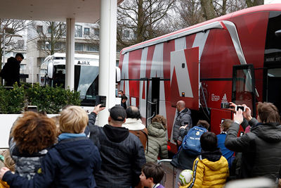 Op zo'n dagje Europees foebele met Ajax is er altijd sprake van wat meer reuring. Zelfs als er geen publiek welkom is. Zo werd de spelersbus ook ditmaal uitgezwaaid. Door een rode fakkelzee stuurde de buschauffeur zijn kostbare lading richting Johan Cruijff Arena. Onze fotograaf was aanwezig en schoot de nodige kiekjes.