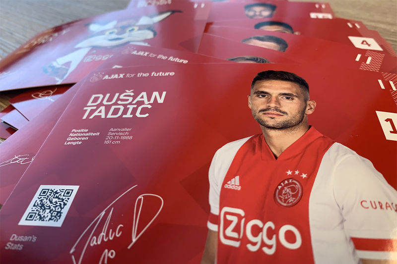 In een setje spelerskaarten vind je alle spelers van Ajax. Dusan Tadic, Andre Onana, Davy Klaassen, Antony… Allemaal! Op het kaartje vind je informatie over de spelers en met je telefoon kun je een code scannen, waardoor je nóg meer te weten komt over jouw helden.