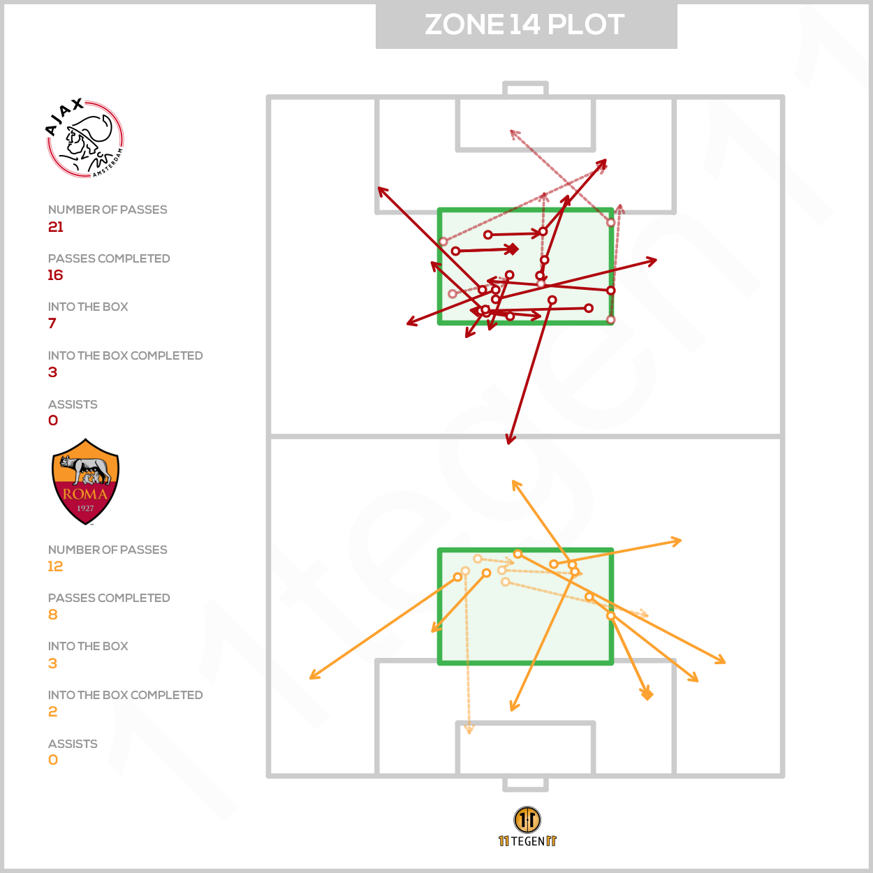 De passes uit Zone 14 laten een iets ander beeld zien, hoewel Ajax nog steeds in het voordeel is. Dit komt ook omdat Roma met twee 'nummers tien' aan de binnenkant speelde, in het centrale vak, ten opzichte van het Ajaxsysteem waarbij juist iets meer nadruk ligt op het voetballen in de halfspaces.