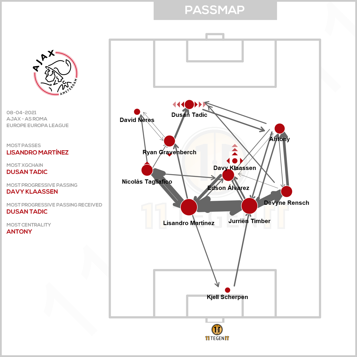 Dit leverde een prima opbouwend Ajax op, zeker gezien het gemis van beste passer Daley Blind. Wel waren er kleine tactische verschillen te zien ten opzichte van hoe er normaal gesproken wordt opgebouwd. Met name spelmaker Gravenberch werd in deze variant tien à vijftien meter hoger op het veld neergezet, tussen het middenveld en de verdediging van Roma. Dit is ook duidelijk te zien aan zijn gemiddelde positie op de passmap.