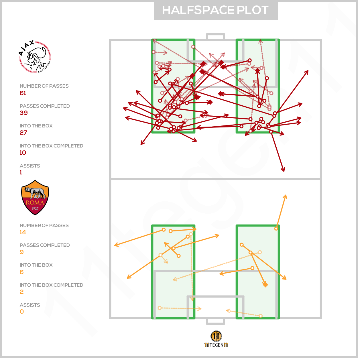 De ‘keten’ aan de linkerbinnenkant van het veld werd al benoemd. Ook in de halfspace-plot komt terug dat dit Ajax’ favoriete manier was om in de buurt van de goal van Roma te komen. Vooral de ouderwets uitzakkende spits Tadic – die op de gemiste penalty na weer een uitstekende wedstrijd speelde – dook vaak in dit gebied op om vervolgens de lopende Davy Klaassen of de Braziliaanse buitenspelers te bereiken.
