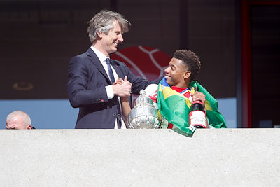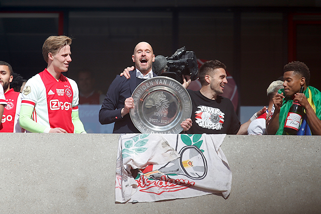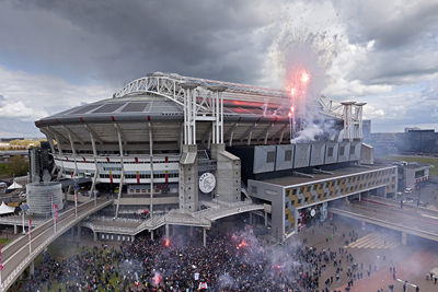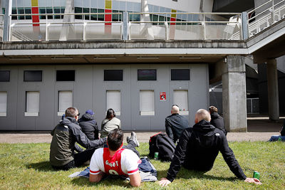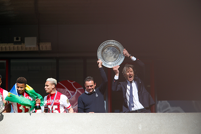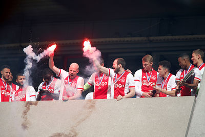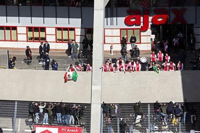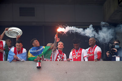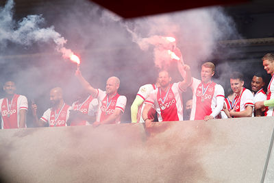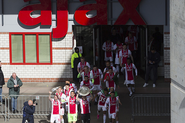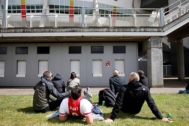 De Johan Cruijff Arena bleef helaas leeg en dus besloten veel supporters hun heil te zoeken rondom het stadion. Op mobiele schermpjes zagen de Ajacieden hoe hun cluppie kampioensschap nummer 35 veiligstelde, om erna een kort feest met de spelers te vieren. Daarom presenteren we een dik fotoverslag!