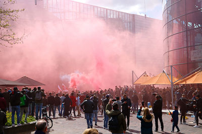 Na het laatste fluitsignaal verzamelden veel supporters zich bij het bordes. Er was vooraf opgeroepen weg te blijven, maar het was wel duidelijk dat dit niet zou gebeuren. De noodverordening die de gemeente voor veel delen van de stad had afgekondigd, gold niet in het gebied rond het stadion.