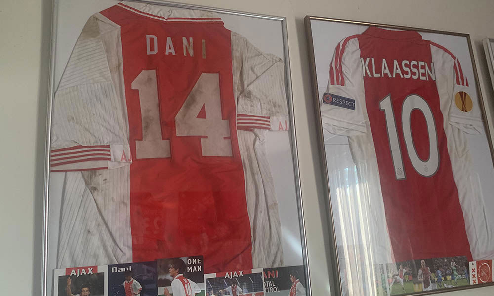 Aan de muur valt ons oog op een thuisshirt van Dani uit 1997. Nummer 14 op de rug en duidelijk is dat de Arena-grasmat in die tijd niet al te best was. De moddervlekken hebben het shirt flink besmeurd. “Dit shirt komt uit het thuisduel met FC Twente. Van een oude man gekregen, die mijn facebookpagina volgde en deze had liggen. Puur geluk. Het is maar goed dat het shirt achter glas zit, want hij stinkt behoorlijk naar zweet en alles.”