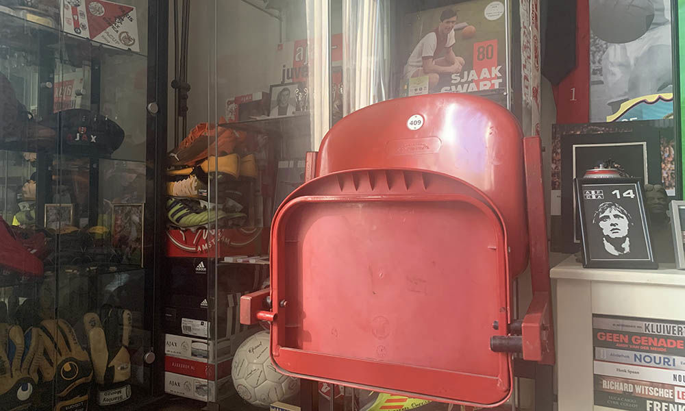 Dingen uit de fanshop vind je niet bij Roel. Hevig onder de indruk nemen we plaats op een dug-out-stoel van de Johan Cruijff Arena, in de hoek van de woonkamer. “Deze heeft echt in de Arena gestaan en is twaalf jaar geleden geveild. Een man uit Apeldoorn had ‘m en zei dat-ie weg mocht. Ben gelijk in de auto gestapt om ‘m op te halen.”