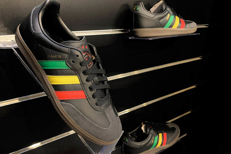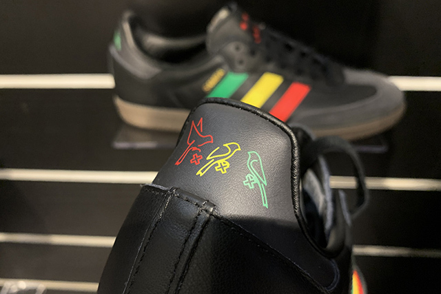 Het trainingspak is in precies dezelfde stijl als het derde tenue, terwijl Adidas er ook een stel bijpassende schoenen bij presenteert. 'Three Little Birds' op de achterzijde, terwijl het Ajaxlogo er bovenop is gedrukt. De streepjes op de schoenen zijn er, hoe kan het ook anders, in rood, geel en groen op gestikt.