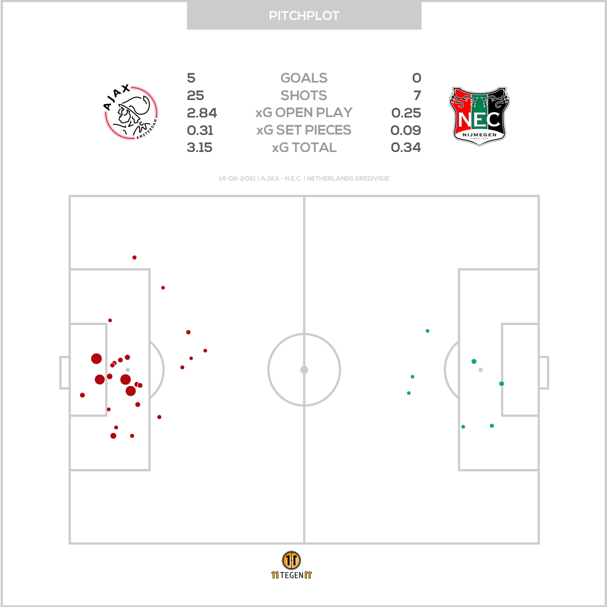 Ajax gaf vol gas tegen NEC en spoelde aanvankelijk de vervelende nederlaag tegen PSV weg, om vervolgens in een wandeltempo de wedstrijd uit te spelen. Toen het stof was neergedaald was de schotenverhouding 25-7 en het aantal goals vijf tegen nul. We bespreken het openingsduel van het eredivisieseizoen in deze terugblik aan de hand van de statistieken!