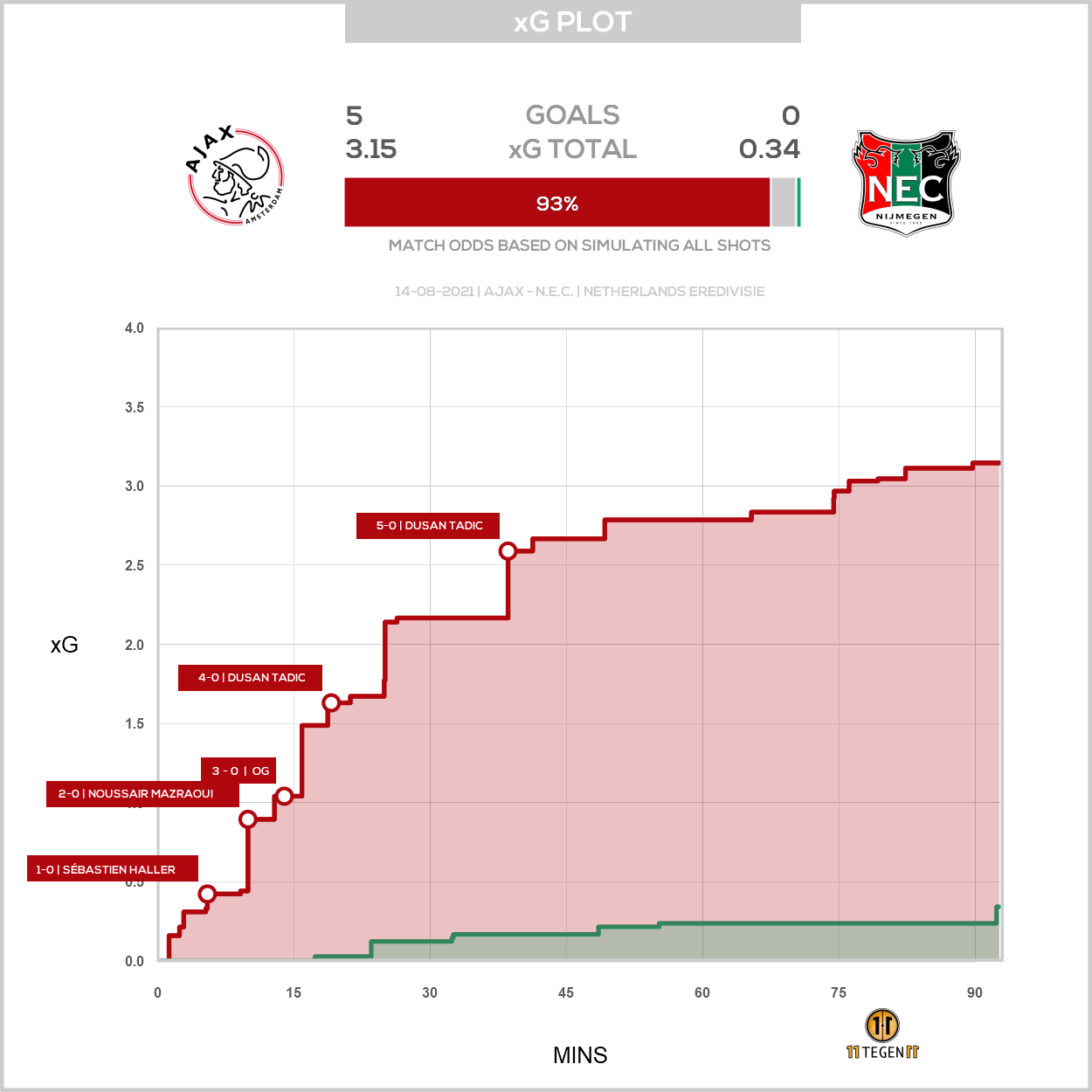 Aan de afbeelding hieronder is af te lezen dat het aantal goals dat Ajax scoorde niet eens volgens de verwachting van het model was. Vijf goals is netjes en efficiënt gezien het aantal gecreëerde kansen. Al was NEC natuurlijk ook zo vriendelijk om er ook eentje in het eigen goal te schieten…