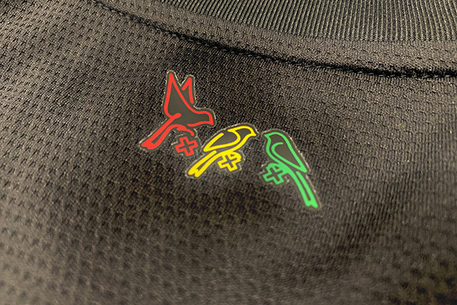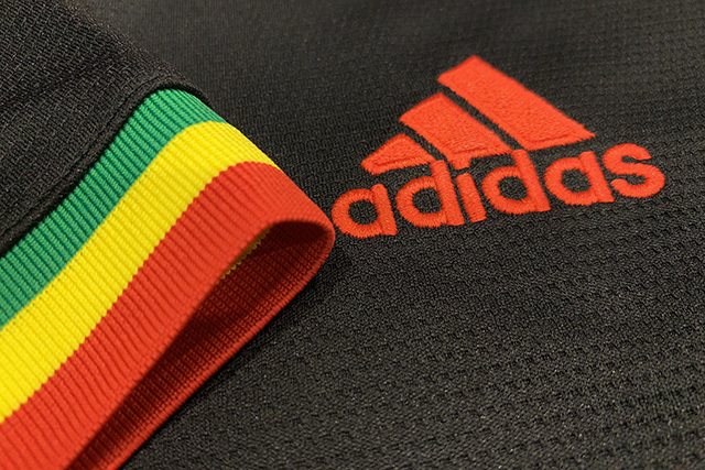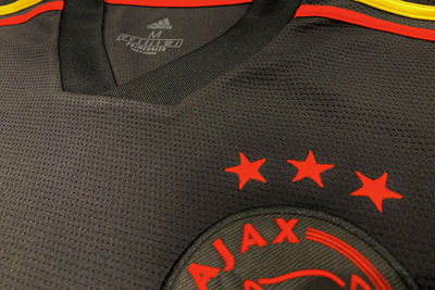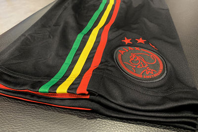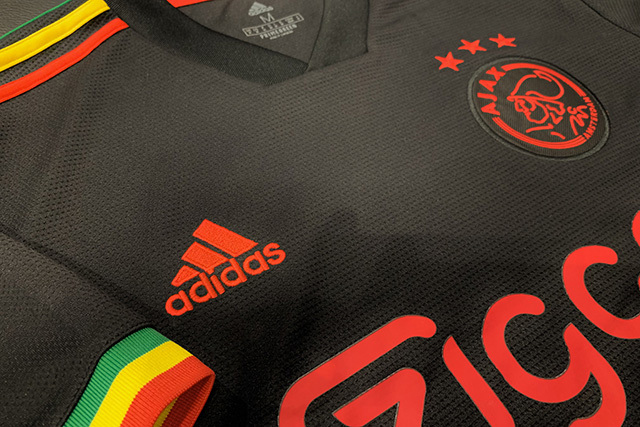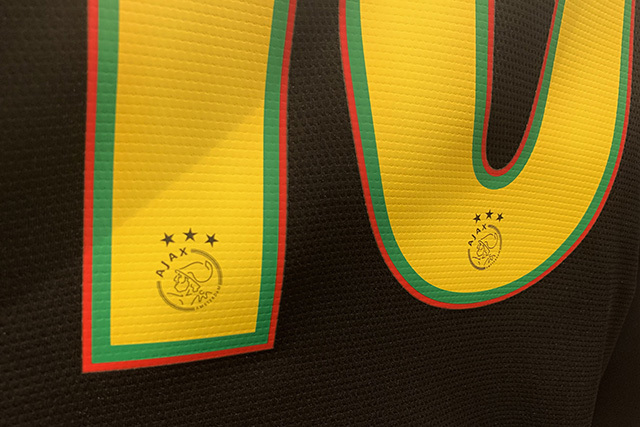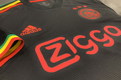 Los van de rastastrepen is het shirt vrij 'clean'. De kraag is geheel zwart en de verdere bedrukking rood of geel. Op de borst zien we een zwart embleem met het Ajaxlogo in rood opgestikt. De drie sterren boven het logo zijn ook volledig in rood aangebracht. Vooral tof: de namen en rugnummers worden in heldere rastakleuren op het shirt geperst!