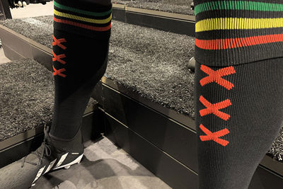 De stijl van het shirt is doorgevoerd in het volledige tenue, want eronder dragen de Ajacieden straks zwarte shorts én zwarte kousen. Deze zijn eveneens voorzien van Adidasstrepen in rastastijl. In de kousen zijn verder drie rode andreaskruisjes verwerkt.