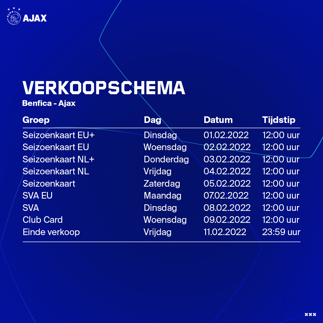 Er komen 3.250 kaarten beschikbaar voor Ajaxsupporters. De kaartverkoop start dinsdag 1 februari om 12.00 uur en de kosten per kaartje bedragen 37,50 euro. Bekijk hieronder het volledige verkoopschema, zodat je weet wanneer je eventueel aan de beurt bent om een kaartje te kopen.