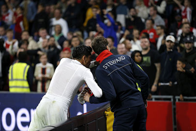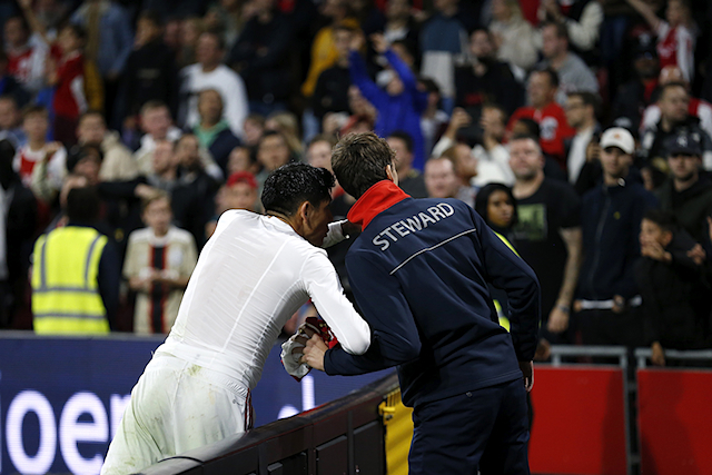 En dus stond Gerard ineens stil. Ietwat bedremmeld. Het publiek in de Johan Cruijff Arena was het er niet mee eens en liet zich horen. Gerard pakte uit zijn kontzak de verklaring waarop staat dat hij toestemming heeft van Ajax om te doen wat hij altijd doet.