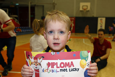 Lucky zelf was natuurlijk ook van de partij. Niet alleen om mee te doen, maar ook voor handtekeningen en foto’s. Cool! En natuurlijk werd er ook gevoetbald. Met toffe Ajaxballen, die alle deelnemertjes daarna mee naar huis mochten nemen. Net als het behaalde diploma!
