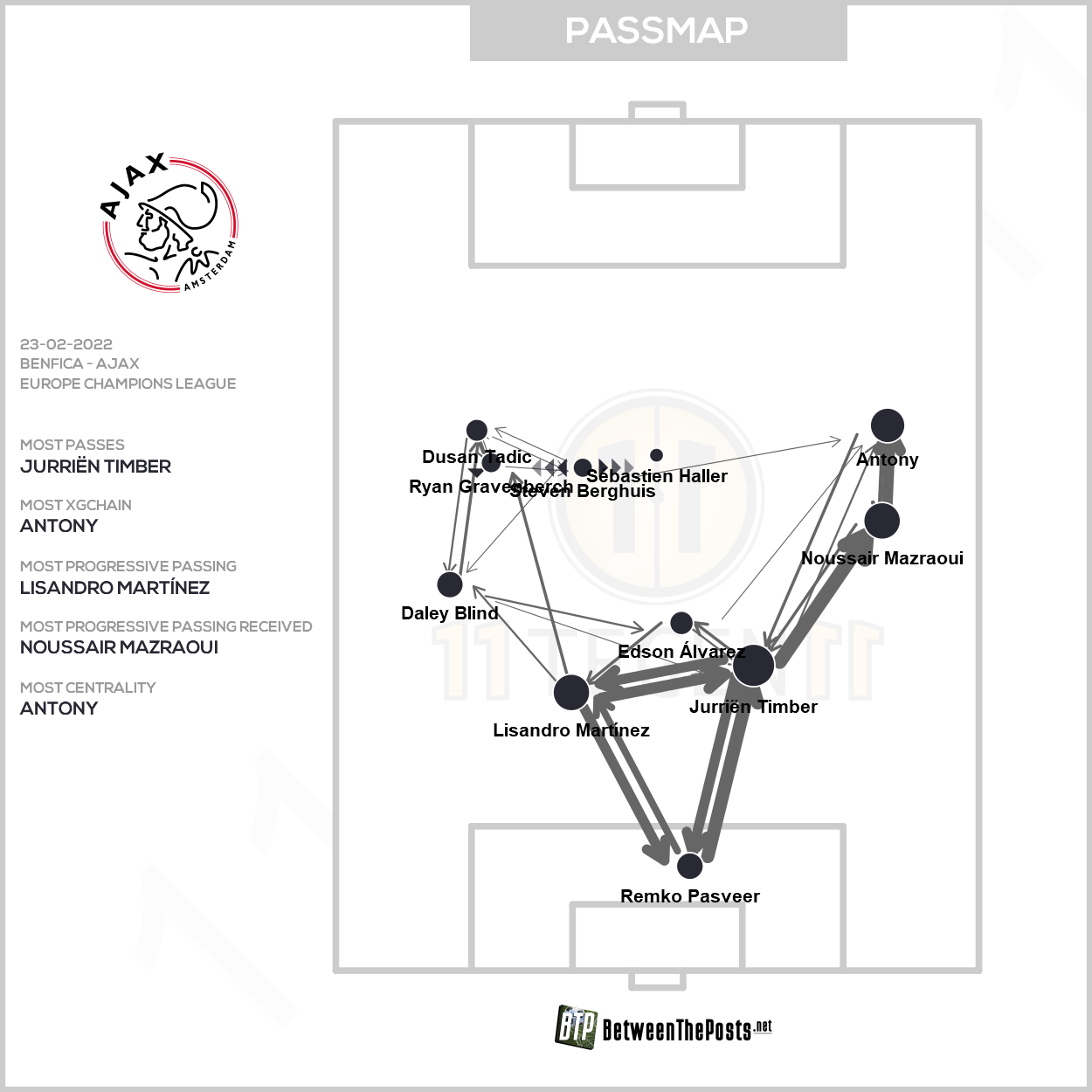 De jonge middenvelder speelde uiteindelijk een redelijke pot, maar Benfica - Ajax was niet een wedstrijd die werd beslist door individuele spelers. Uiteindelijk bleken de problemen van Ajax meer op teamniveau te liggen, dan bij één individu. We blikken terug op deze Champions League-kraker aan de hand van de passmaps en Expected Goals, verkregen via 11tegen11.