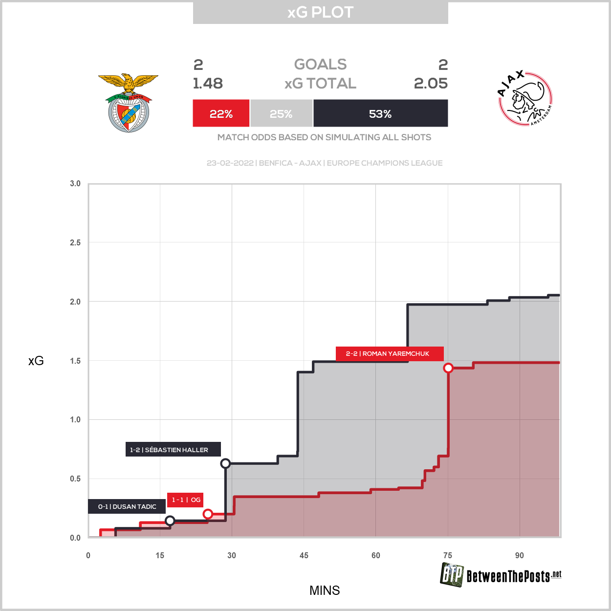 Als we naar de Expected Goals kijken, zien we duidelijk een wedstrijd met twee gezichten. Bij rust was het qua gecreëerde kansen nog een ‘niets-aan-de-hand-wedstrijd’ voor Ajax. De exacte verhouding qua Expected Goals lag volgens het model op 1.49 voor en 0.37 tegen, waarbij de ene goal van Benfica ook nog redelijk gelukkig tot stand kwam door een glijpartij van Noussair Mazraoui en een ongelukkige eigen goal van Sébastien ‘maatje 47’ Haller.