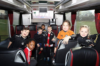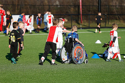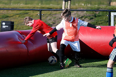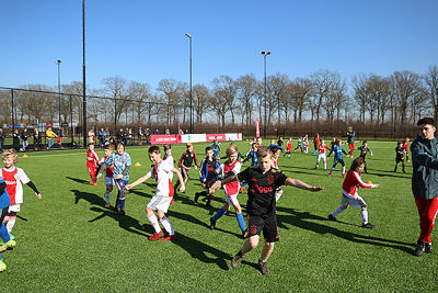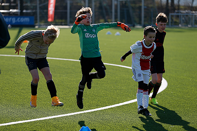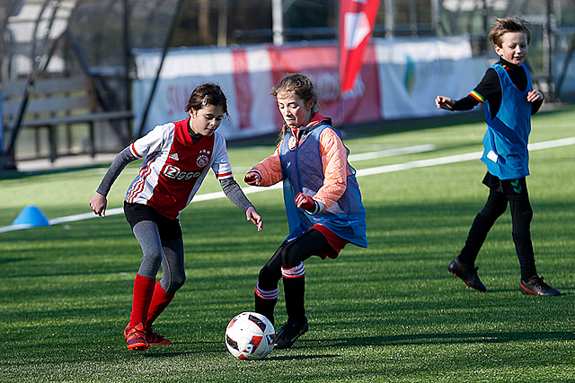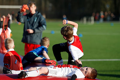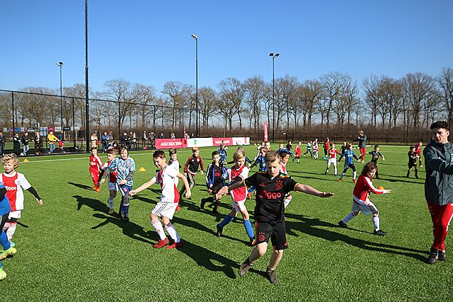 Nadat de spiertjes goed waren opgewarmd, werd er volop gevoetbald. Het ene doelpunt was nog mooier dan het andere. Dat werd uiteraard uitbundig gevierd! In combinatie met de vele kleurrijke Ajaxshirts leverde dat fraaie plaatjes op. Van voetballende Ajaciedjes tot stralende koppies in de spelersbus.