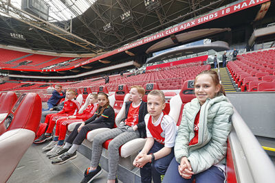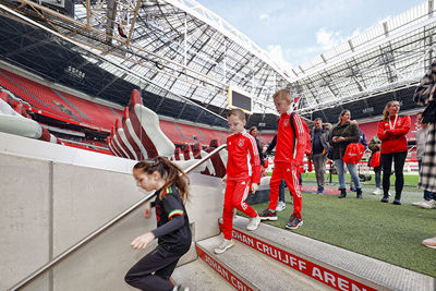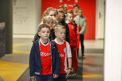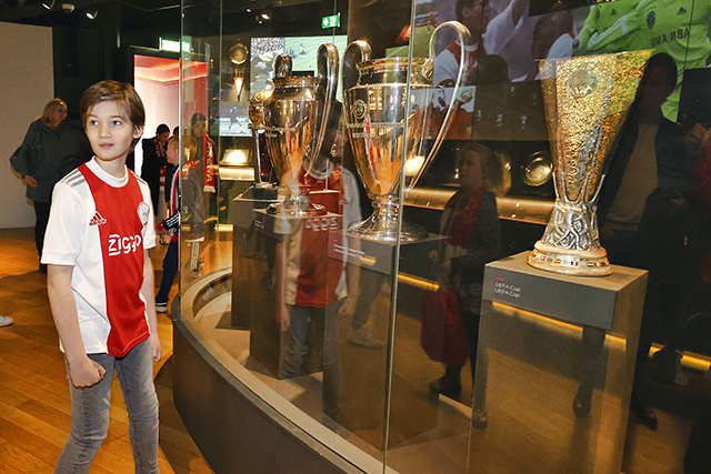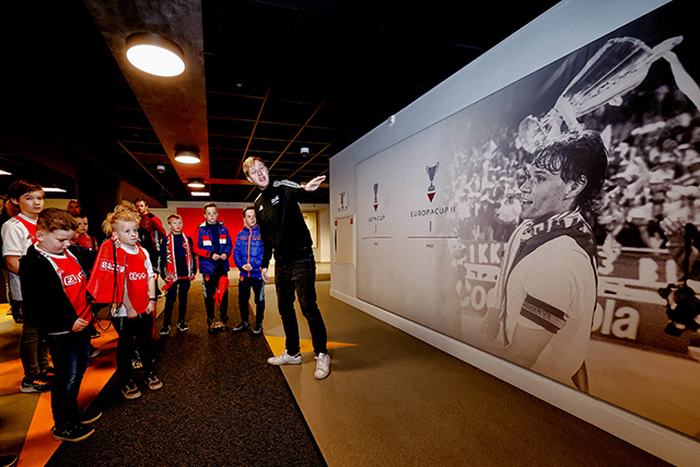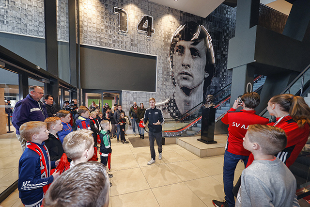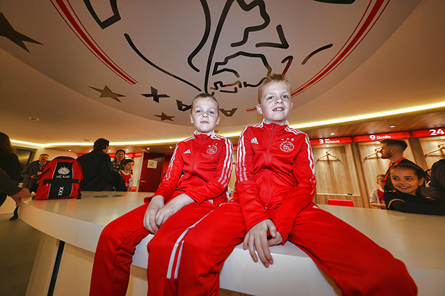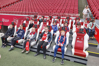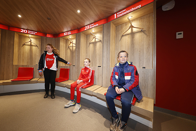 Eerst was het tijd voor een kennismaking met de Johan Cruijff Arena. Op de tribunes kom je als supporter wel vaker, maar een bezoekje aan het veld, de prijzenkast en de kleedkamer voelt wel heel bijzonder. Op de vaste zitplekken van de Ajacieden moesten natuurlijk foto’s worden geschoten, terwijl iedereen ook graag wilde weten waar mannen als Hakim Ziyech, Matthijs de Ligt en Frenkie de Jong voorheen zaten.