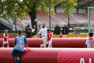 De bonte verzameling aan Ajaxshirts, volle voetbaltasjes en mooi opgepoetste schoenen, maakten al snel duidelijk dat iedereen goed voorbereid was. Klaar voor een potje voetbaldarts, een conditie-oefening of een ouderwets partijtje. Lekker lol maken met leeftijdsgenootjes, dat is immers het belangrijkste tijdens een Ajax Kids Tour, powered by ABN-Amro.