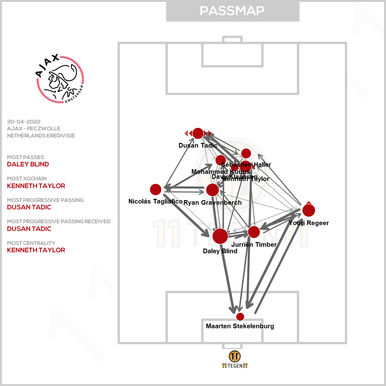 Mede dankzij goed spelende jonge spelers, een treffer uit het niets van Dusan Tadic en het ‘torinstinct’ van Klaassen, won Ajax uiteindelijk met 3-0. We blikken terug op de wedstrijd aan de hand van de passmaps en Expected Goals, verkregen via 11tegen11.