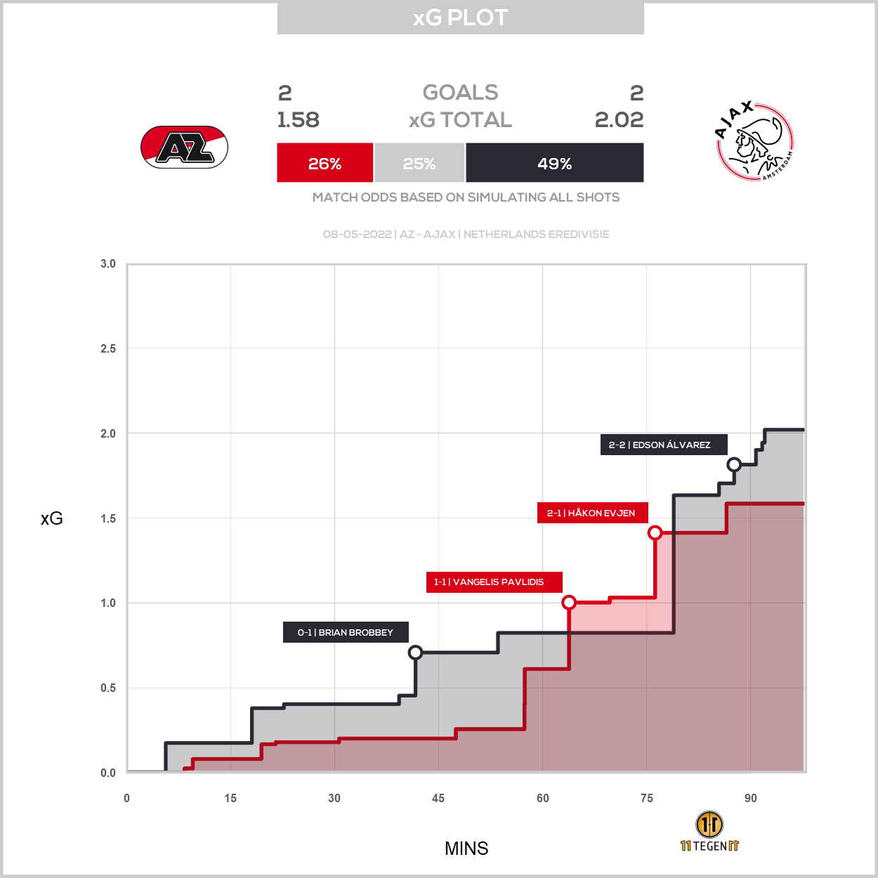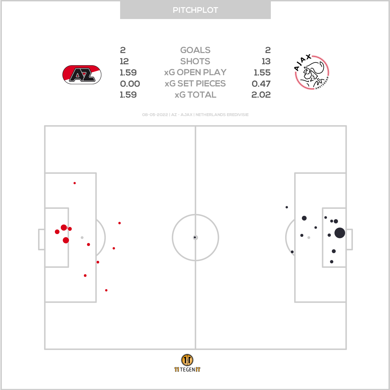 De Expected Goals-totalen bewijzen dat Ajax met weinig verdedigende zekerheid speelde. AZ werd met name in de omschakeling gevaarlijk. Als we alleen naar open spel kijken, kwam de thuisploeg zelfs tot ietsje meer gevaar dan Ajax. De 2-1 van AZ-speler Hakon Evjen wordt niet als spelhervatting gerekend, omdat deze niet direct uit de inworp werd gescoord, maar tien seconden later.