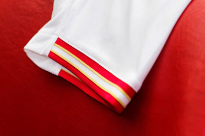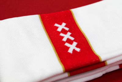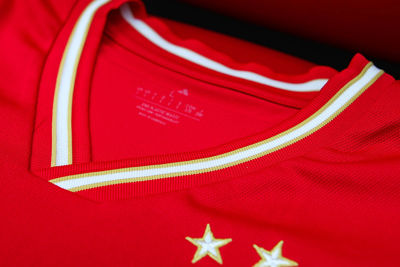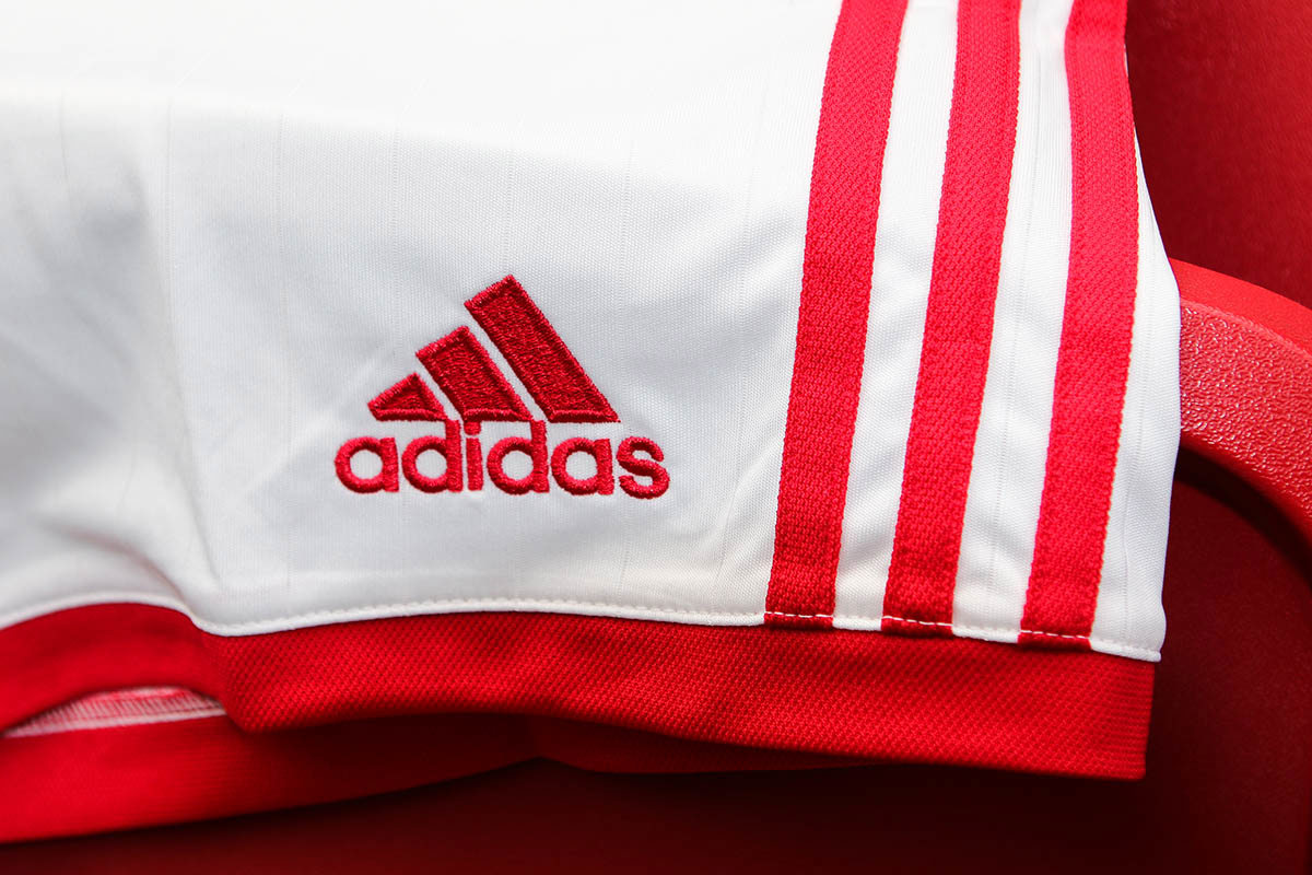 Op alle witte delen in shirt en broekje zijn subtiele lijntjes in het textiel aangebracht. Zie de foto’s hieronder voor een beter beeld. De rode Adidasstrepen vinden we ook terug op shirt, shorts en kousen. In de kousen zijn ook drie Andreaskruizen verwerkt.